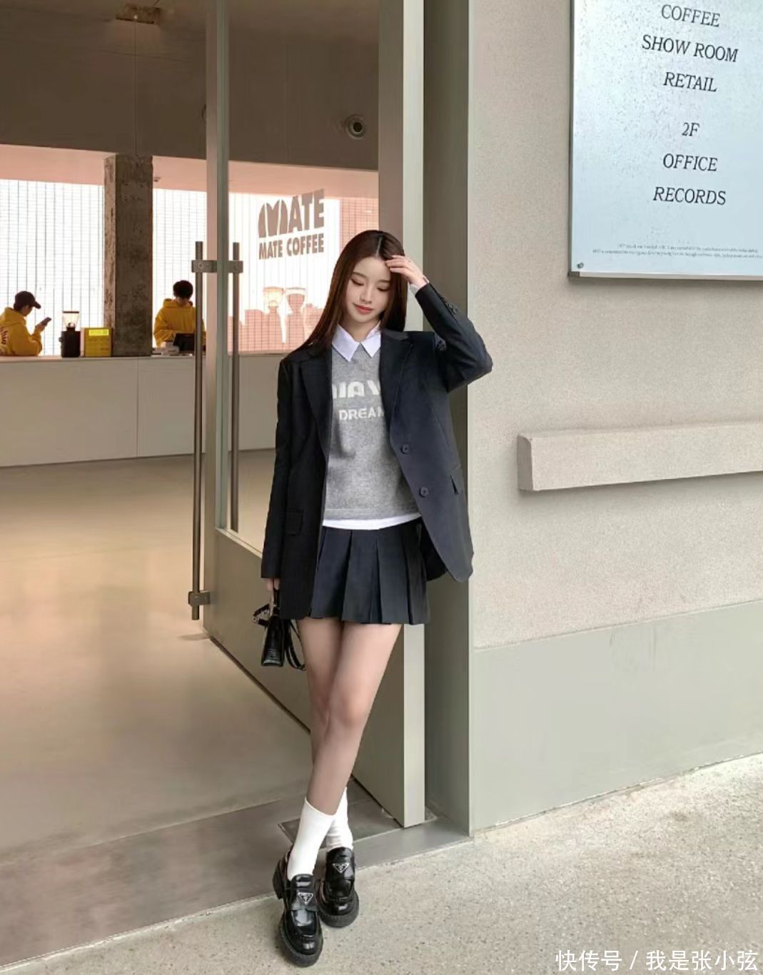 皇冠体育搭建攻略②直筒西装外衣+百褶裙+黑丝白袜